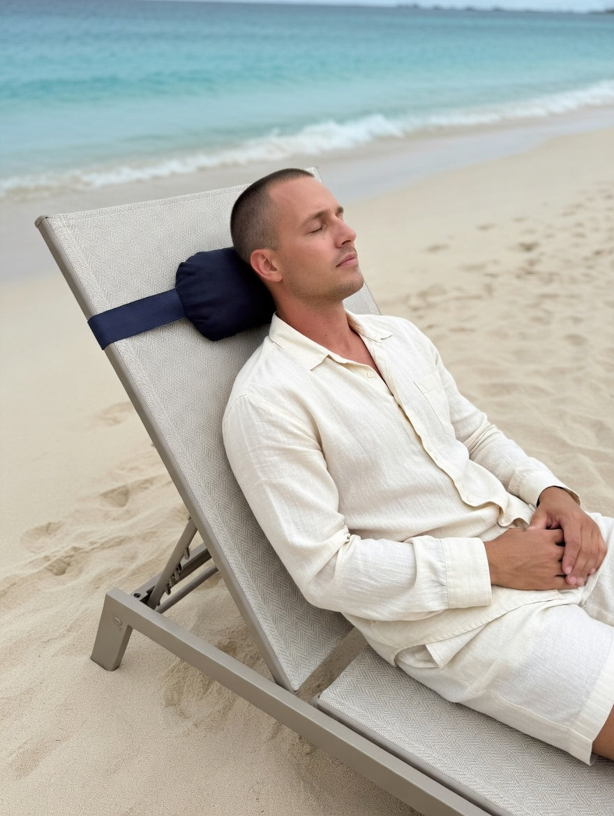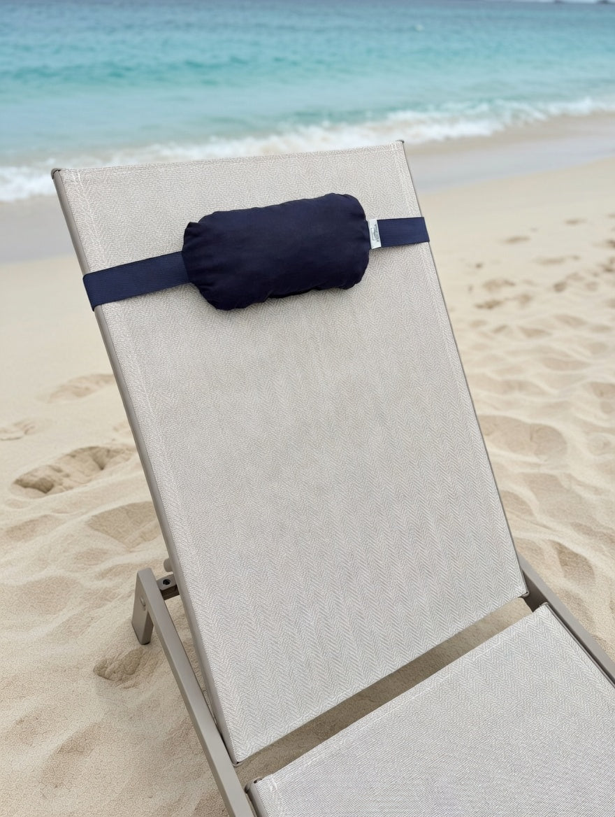 Het Beachcloud Capri kussen combineert een diep donkerblauw kussen met een bijpassende elastische band, speciaal ontworpen voor men die kiest voor comfort en een minimalistische, stijlvolle uitstraling. Een perfecte toevoeging aan elk ligbed, loungestoel of zonnige buitenplek.